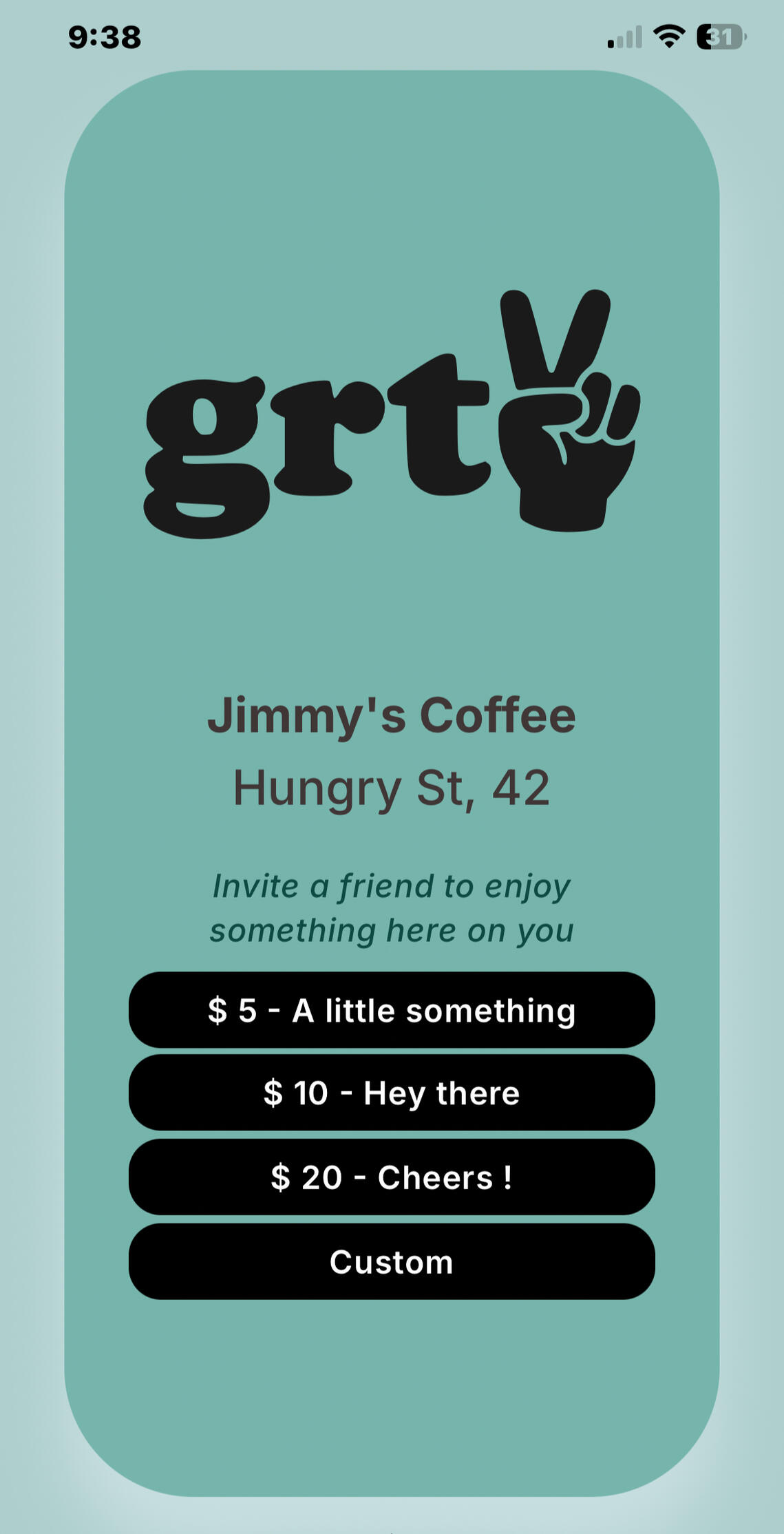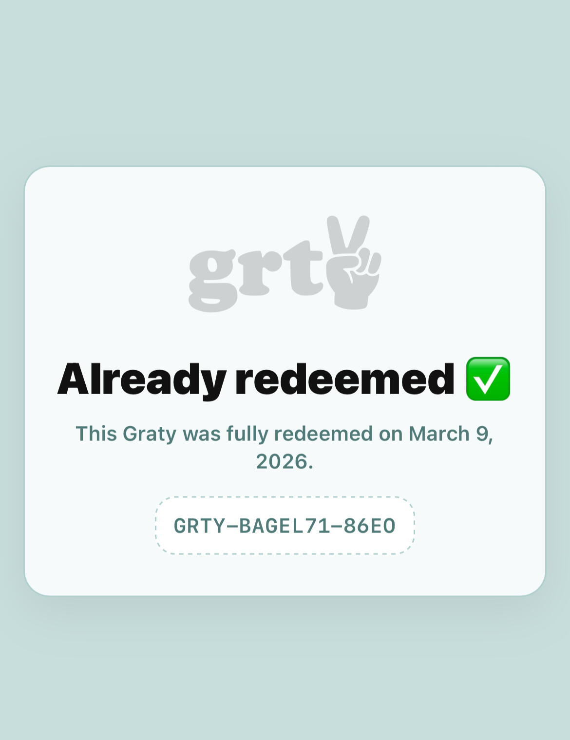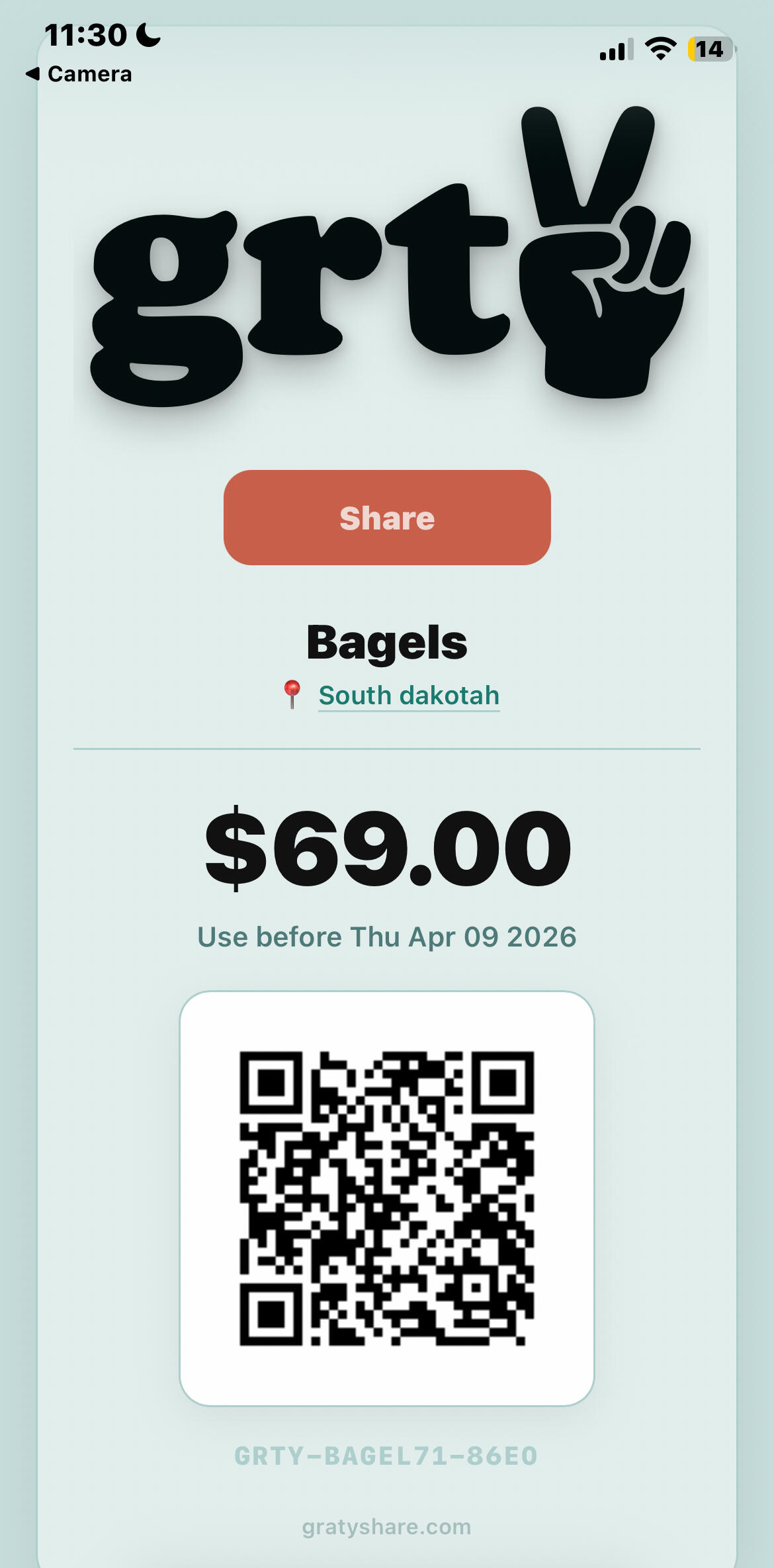 Payments go directly to your account through Stripe — the same payment platform used by millions of businesses worldwide. GratyShare never holds your money. We take a small 4% platform fee, and that's it.When someone comes in to use a Graty, they simply show the QR code and your staff scans it to redeem it. The whole process takes just a few seconds.Posting the QR stickers in a visible spot is all it takes for people to start getting Gratys for others. As the community grows, mentioning it to regulars can help increase your sales. We'll make sure your setup runs smoothly and answer any questions along the way.From there, your place becomes one of the Graty Groves — where people like to share good experiences.