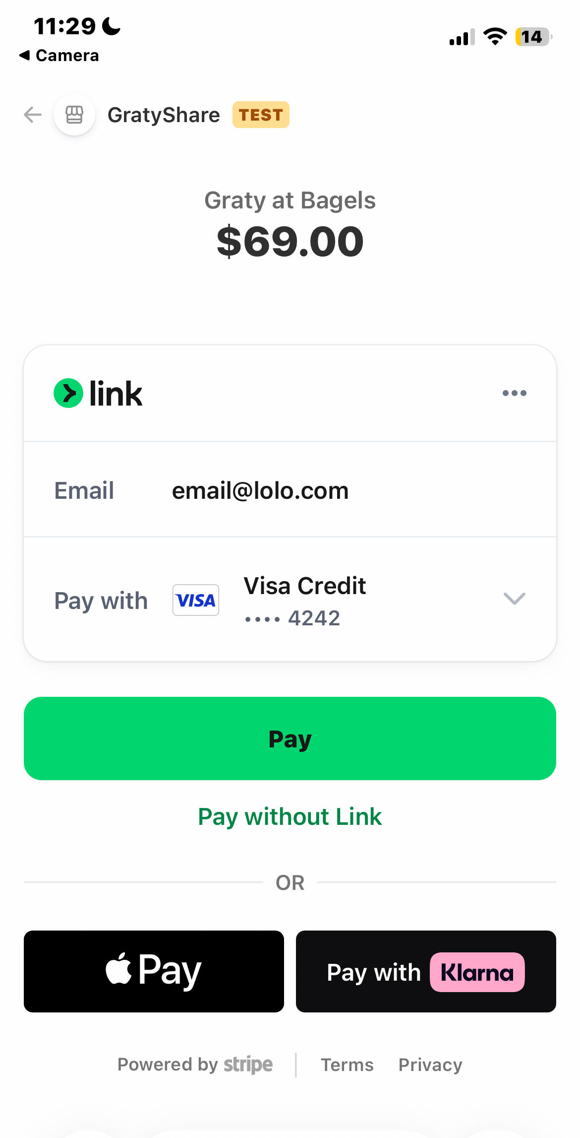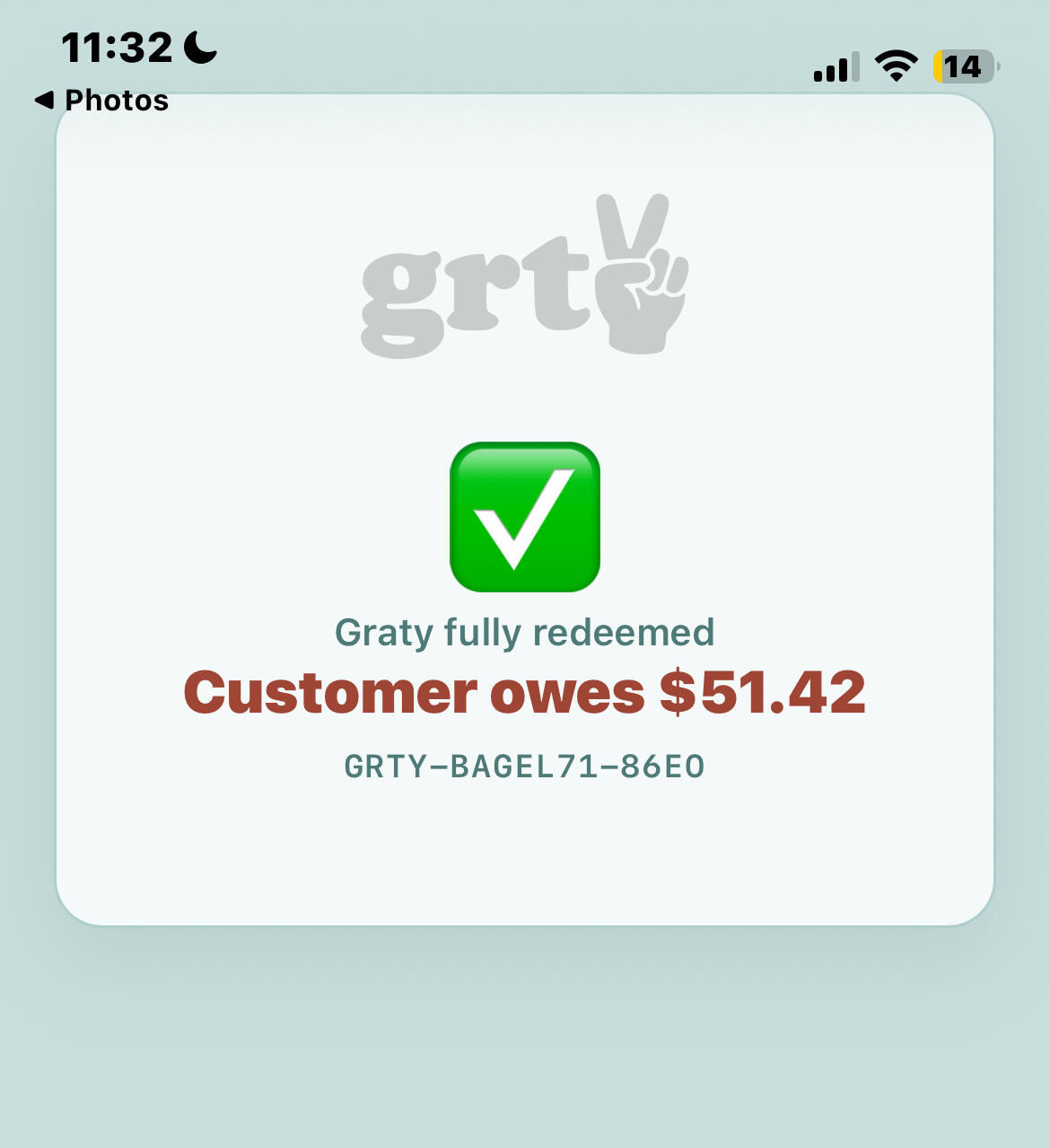 Bill exceeds balance — "Graty covers its part. Customer pays the rest."